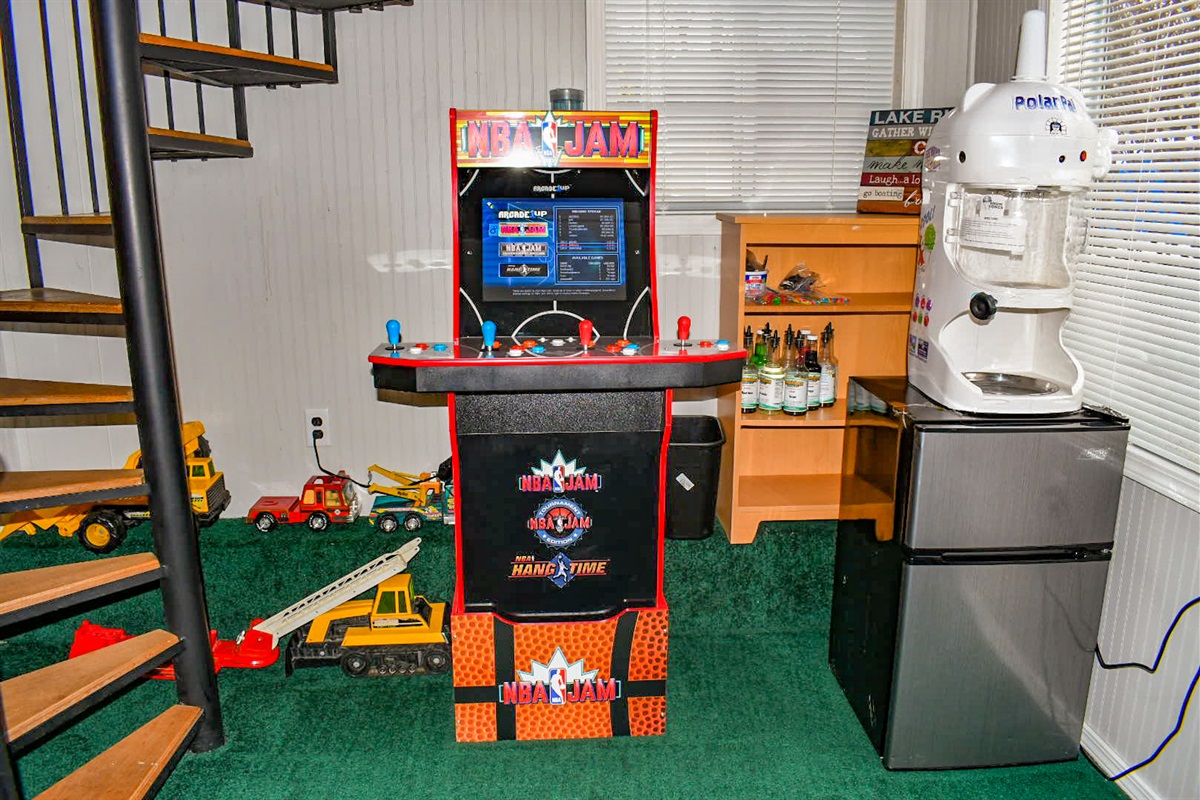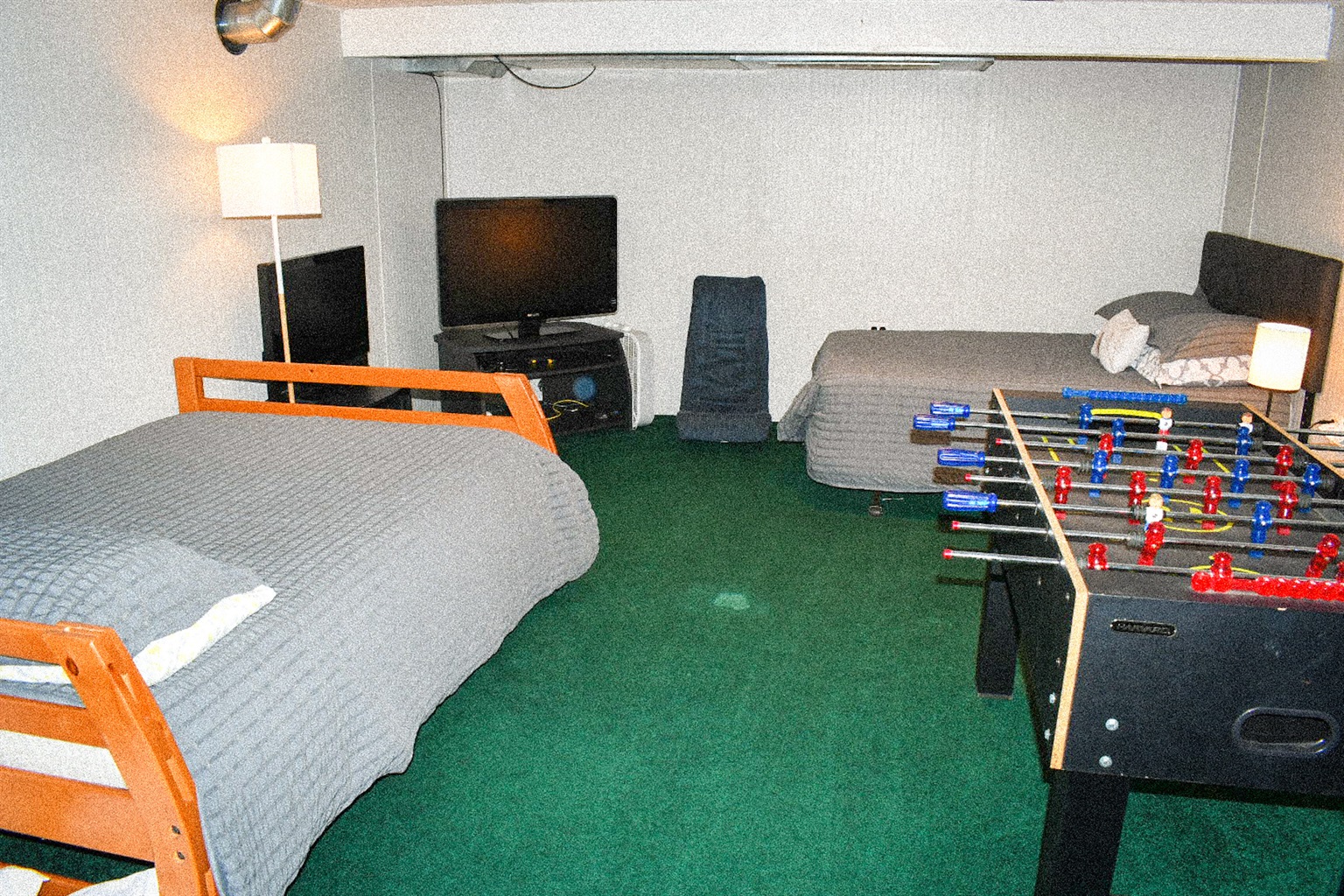In the summer there is plenty of deck space to relax on and a grassy space to put the cornhole boards out. Sit down by the waterfront and relax in the water or sit by a campfire. While indoors, you can enjoy a snow cone while playing darts, foosball or a game of cards.